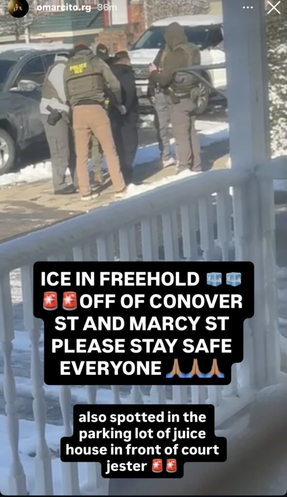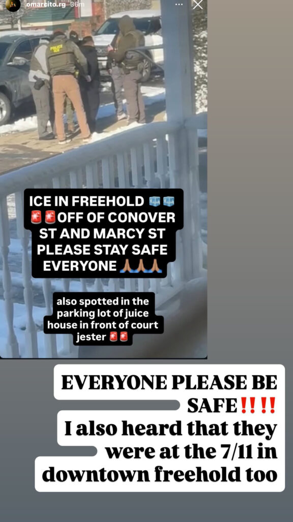 My instincts told me to check Omar’s Instagram. When I clicked on his story, there I saw a photo of four ICE agents arresting a man. Omar captioned the photo in big letters, “ICE IN FREEHOLD OFF OF CONOVER ST AND MARCY ST PLEASE STAY SAFE EVERYONE” and added “also spotted in the parking lot of Juice House in front of Court Jester.”