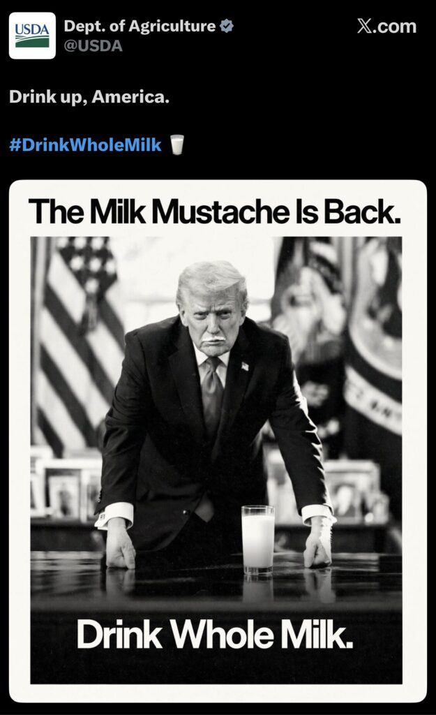 Days before the Whole Milk for Healthy Kids Act was enacted into law, the United States Department of Agriculture (USDA) posted on X (formerly Twitter) a photo of Trump with a milk moustache, with a glass of milk in front of him. The words “The Milk Moustache Is Back” and “Drink Whole Milk” are plastered on the photo.