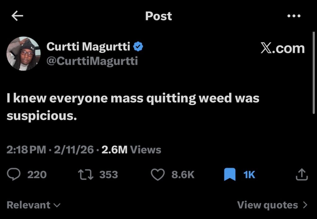 A third post on X that I saw, this time coming from Curtti Magurtti (@CurttiMagurtti), a content creator I have followed for a few years, expressed his suspicion of people “mass-quitting” weed at the same time.